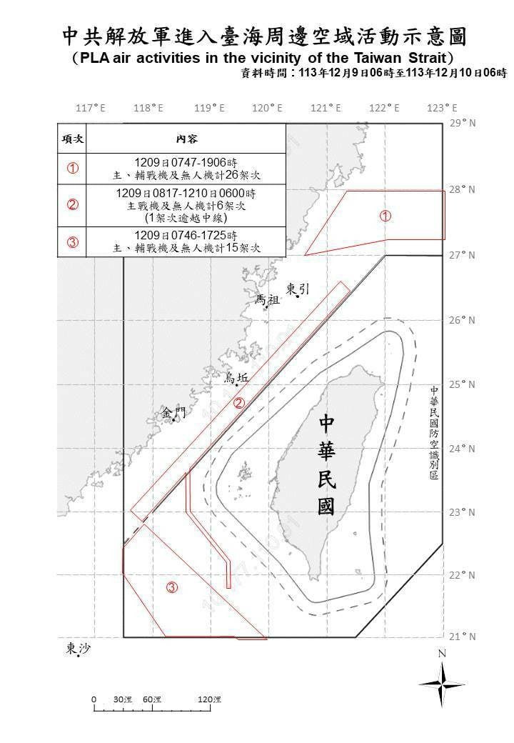 47 military aircraft, of which 26 flew in the area north of Taiwan off the coast of China's Zhejiang Province, six in the Taiwan Strait and another 15 in the southwest of the island (flight area diagram)
